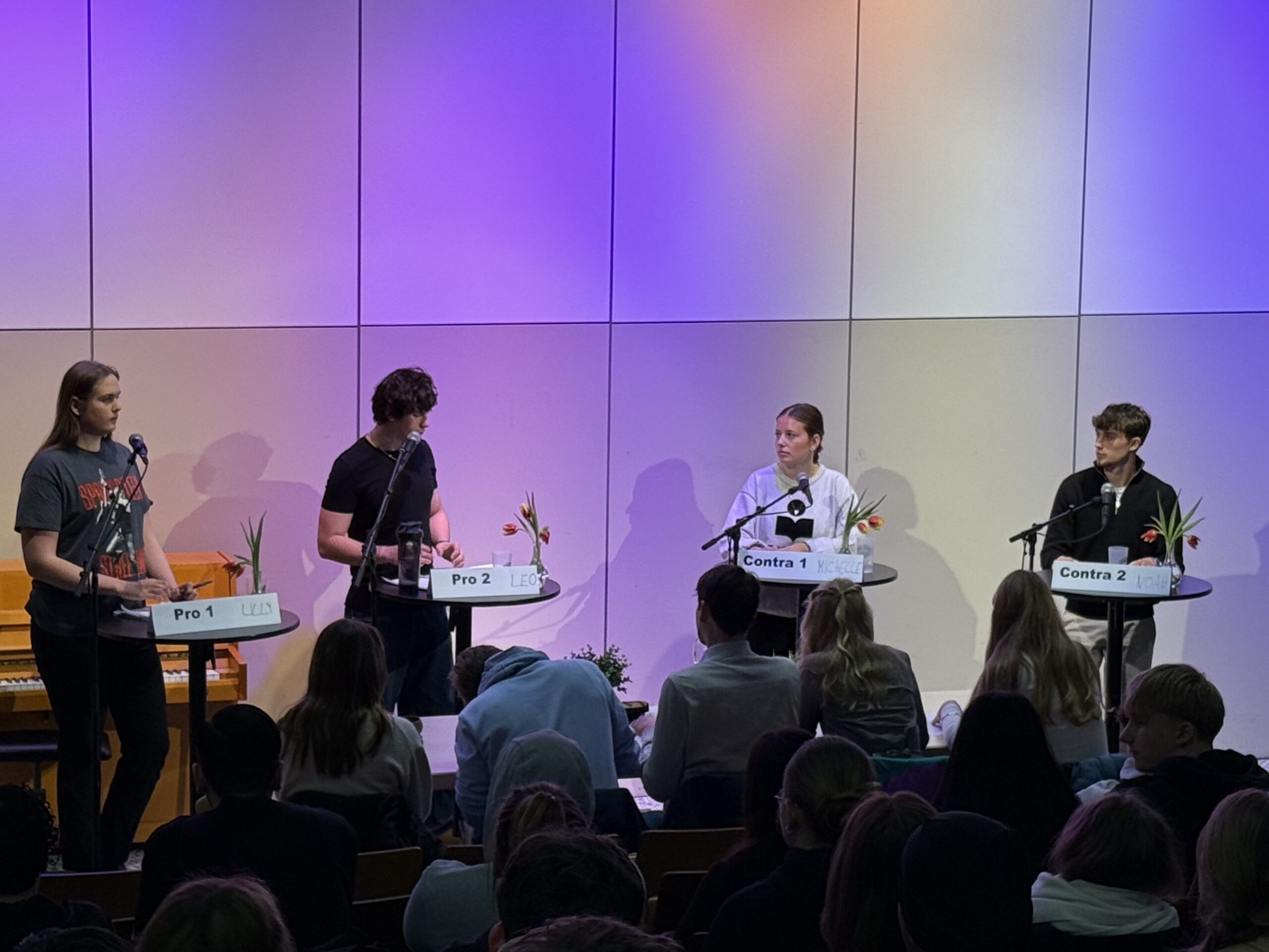 Diese Woche fand erneut der Schulwettbewerb „Jugend debattiert“ mit dem 11. Jahrgang statt. Nach drei Vorrunden debattierten die vier Finalist*Innen zu der Streitfrage: „Soll für das Fahren von E-Scootern eine Führerscheinpflicht gelten?“. Im Hörsaal erlebte man einen interessierten und wertschätzenden 11. Jahrgang. Am Ende überzeugte und gewann Lilly (11N), gefolgt von Noah (11S), Leo (11G) und Michelle (11K).